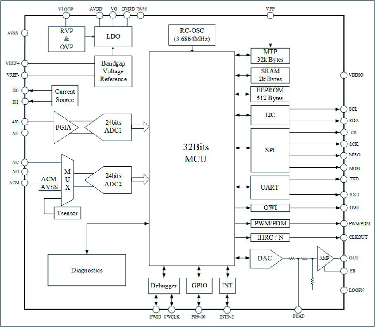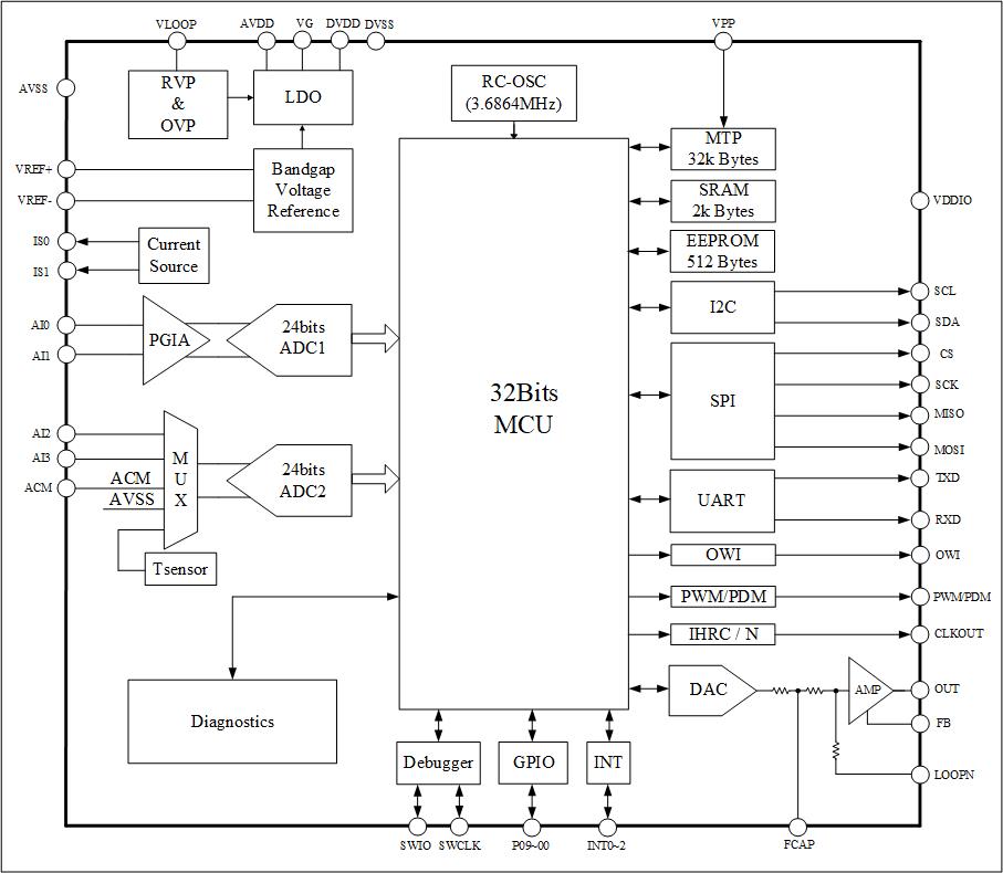 • 内置双24 bits ADC,低噪声PGA,支持差分和单端输入,可切换至内部温度传感器