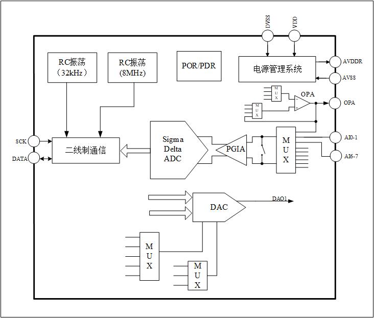 本芯片内置24位ADC、两线制通信等电路。