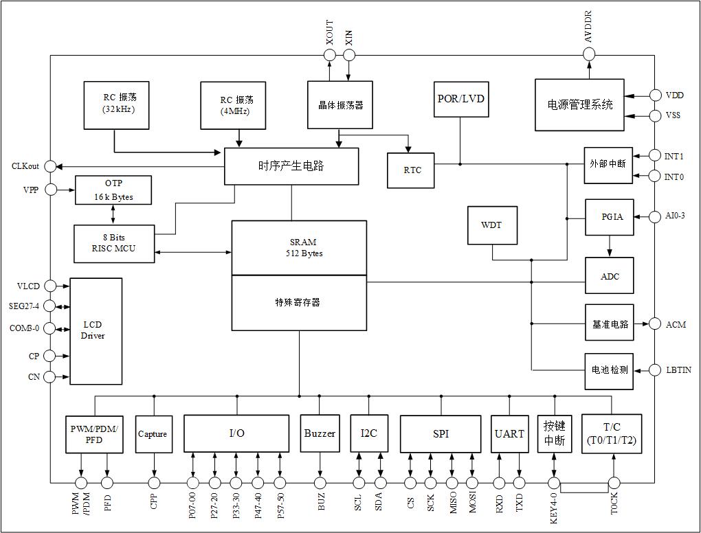 本芯片是高精度24位ADC的SoC产品,外围资源丰富:RTC,可选的多种稳压电源输出,灵活设置的PGIA模块,升压模块, UART、I²C、SPI、TIMER、PWM/PDM、PFD、CAPTURE输出模块,LCD驱动等。