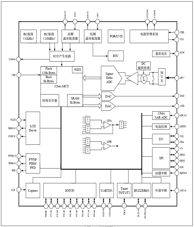 芯片是带有LCD驱动和24位高精度ADC的32位MCU的SOC产品,提供120KB Flash空间用于存储用户程序。